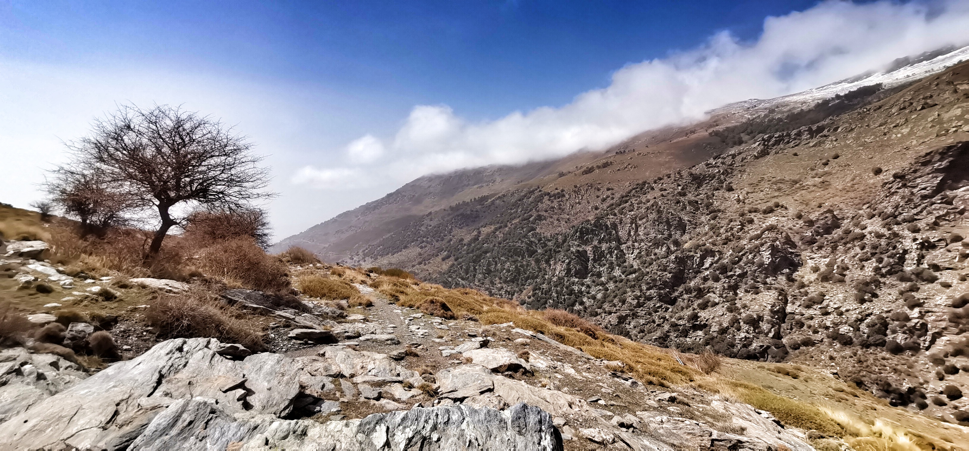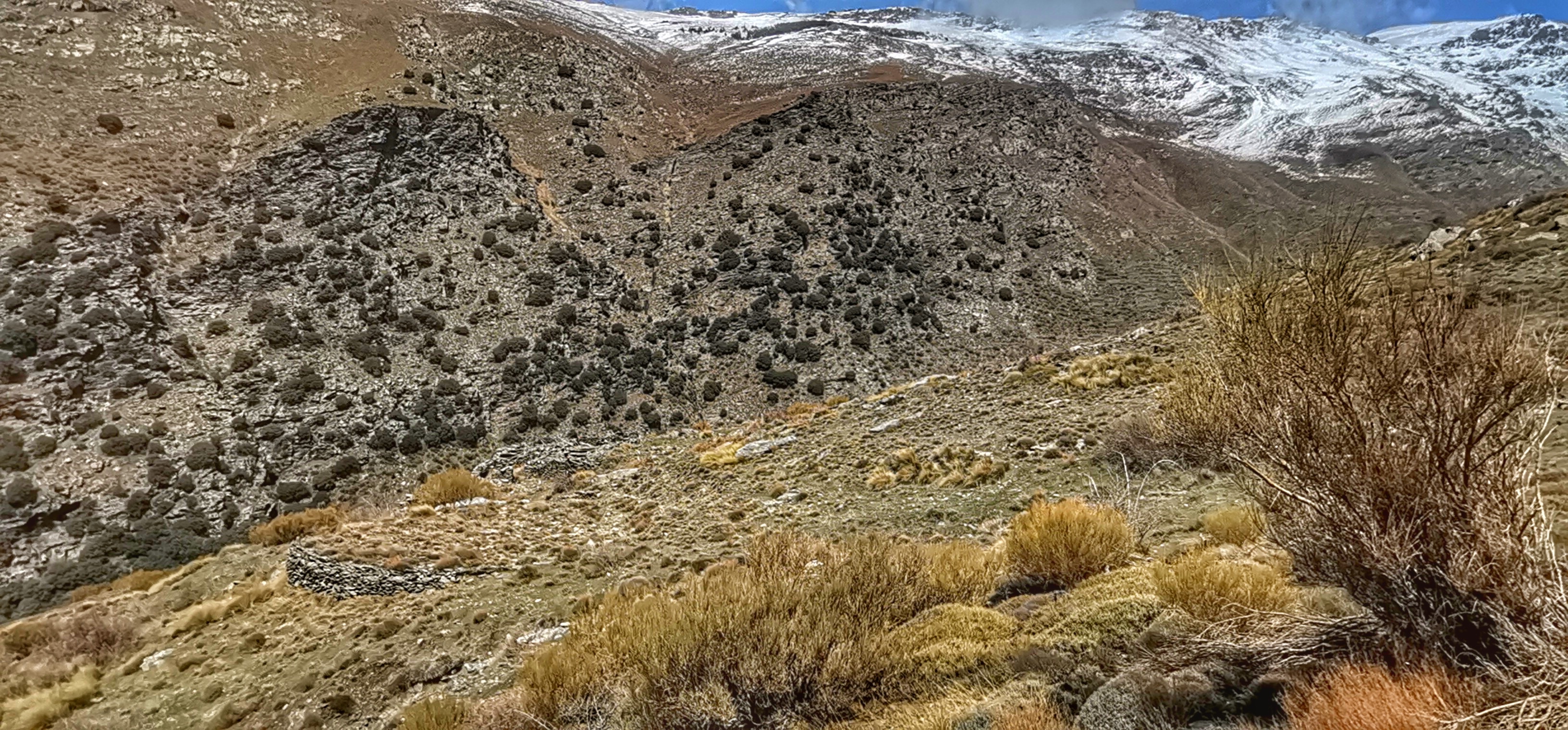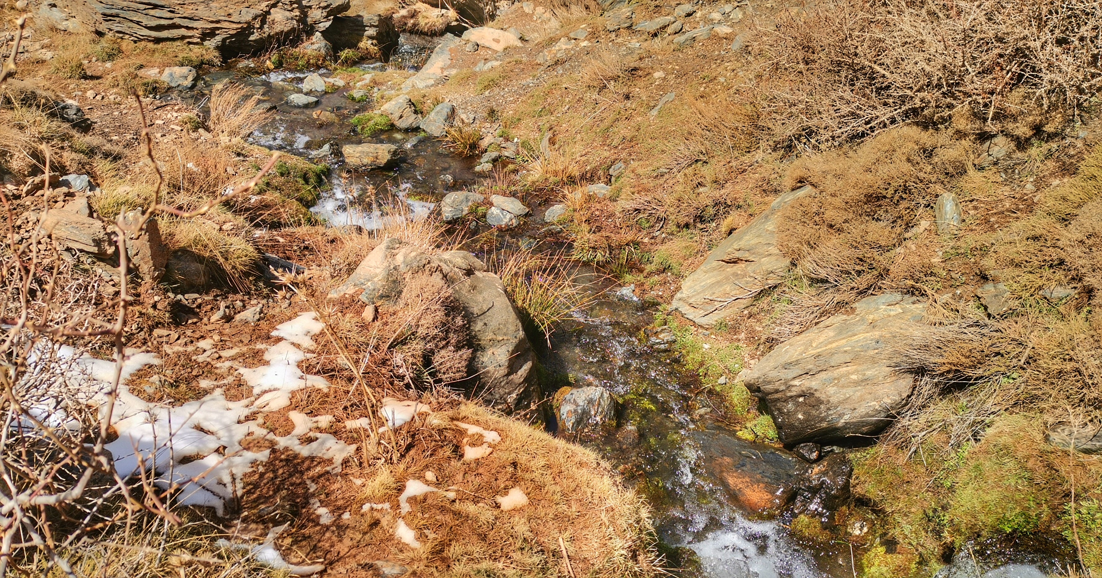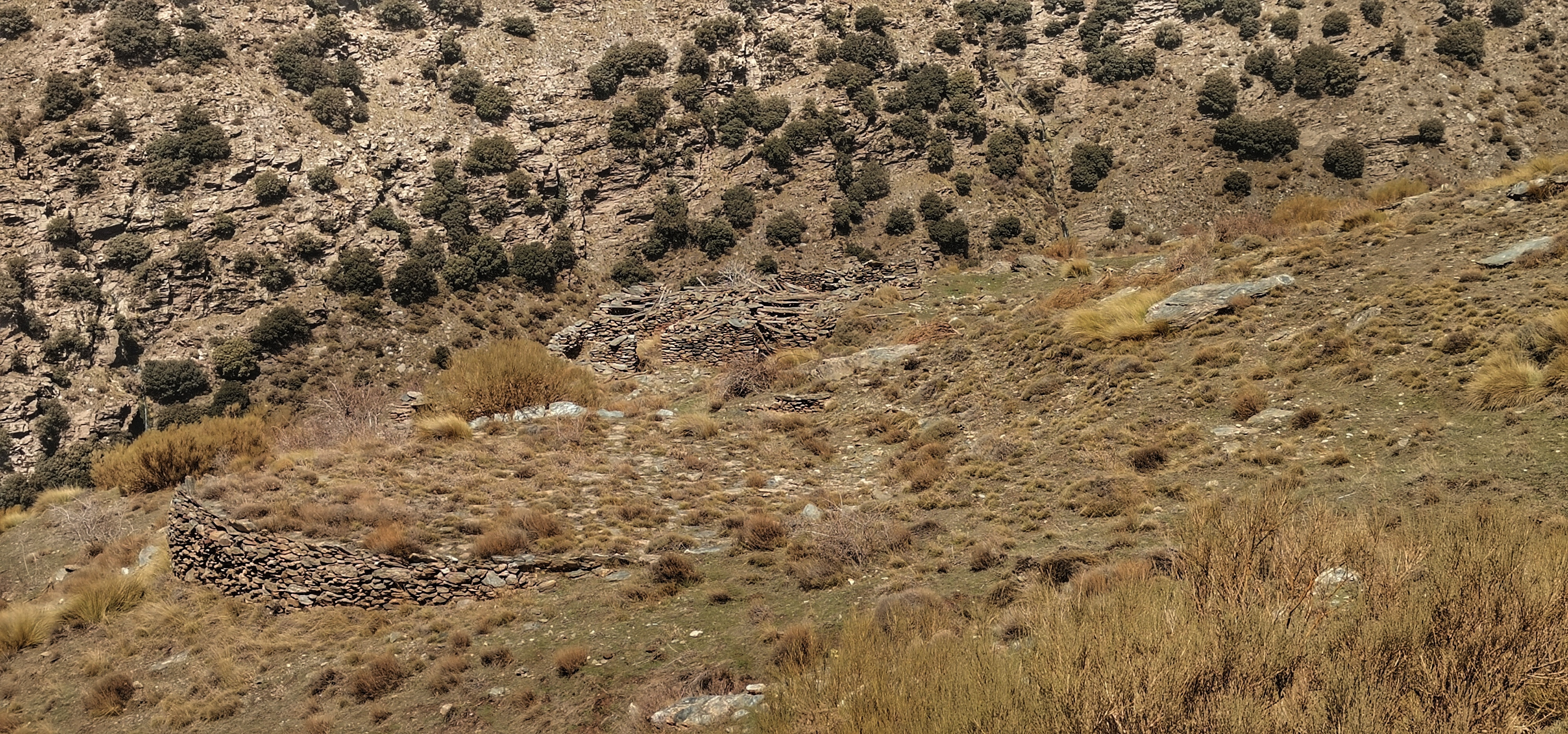 A partir de ahí, toma como eje la citada acequia, avanzando hacia el norte para dejar a su paso, a la izquierda, el Cortijo de Calvache. Más adelante y sirviéndonos aún de la Acequia Alta, entra en zona de repoblación forestal dejando a su izquierda el Cortijo de Prado – Abarca al igual que el Cortijo del llano del Espino. Continuando por la Acequia Alta, se dirige al nacimiento de la misma en el río Lanjarón pasando antes de llegar allí por el Puntal del Barranco Grande y por encima del lo que se conoce como el Haza del Enano.