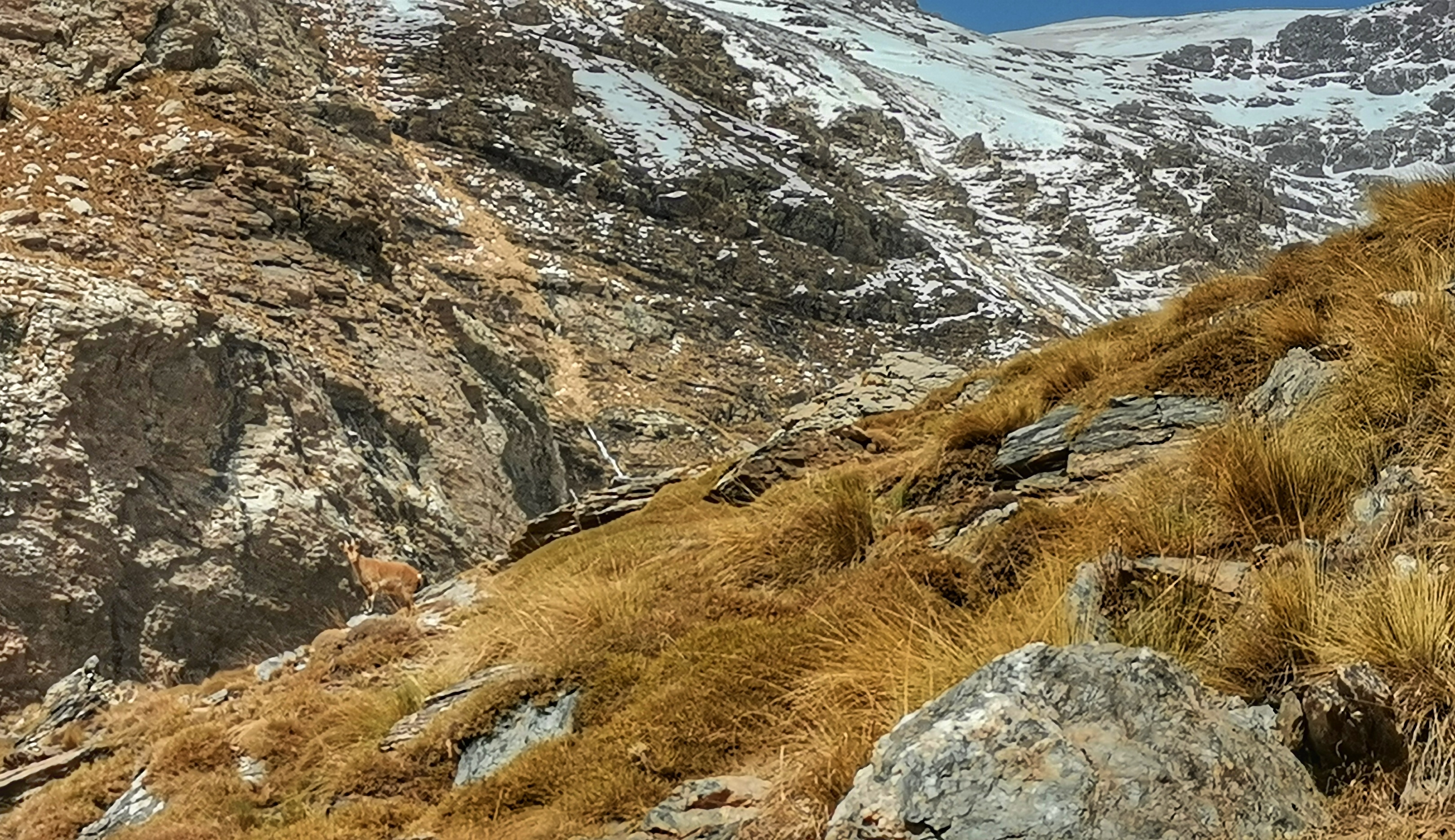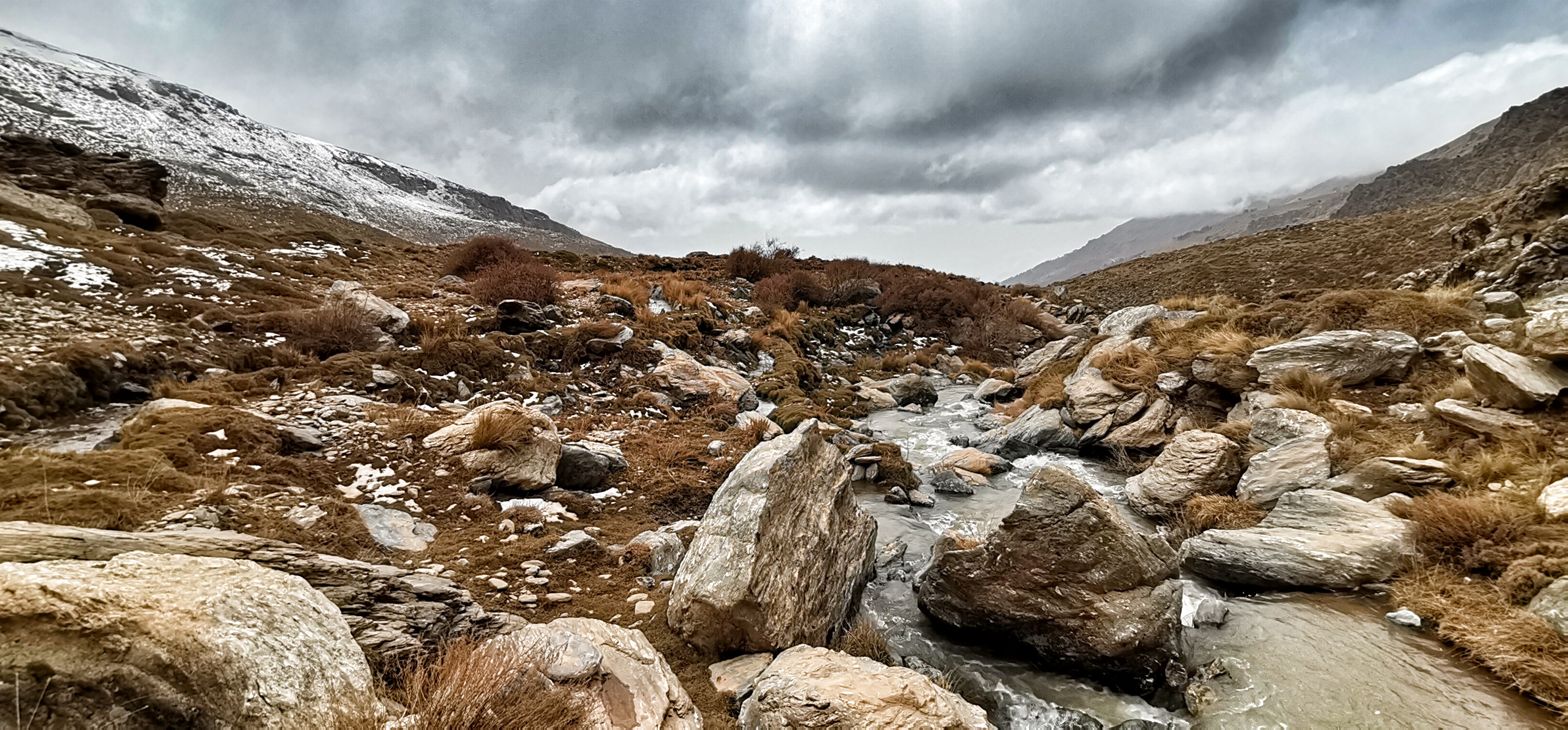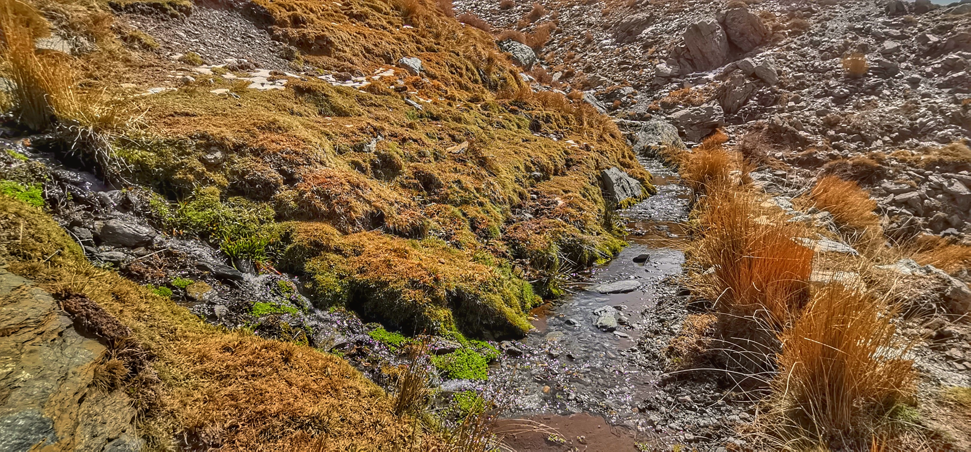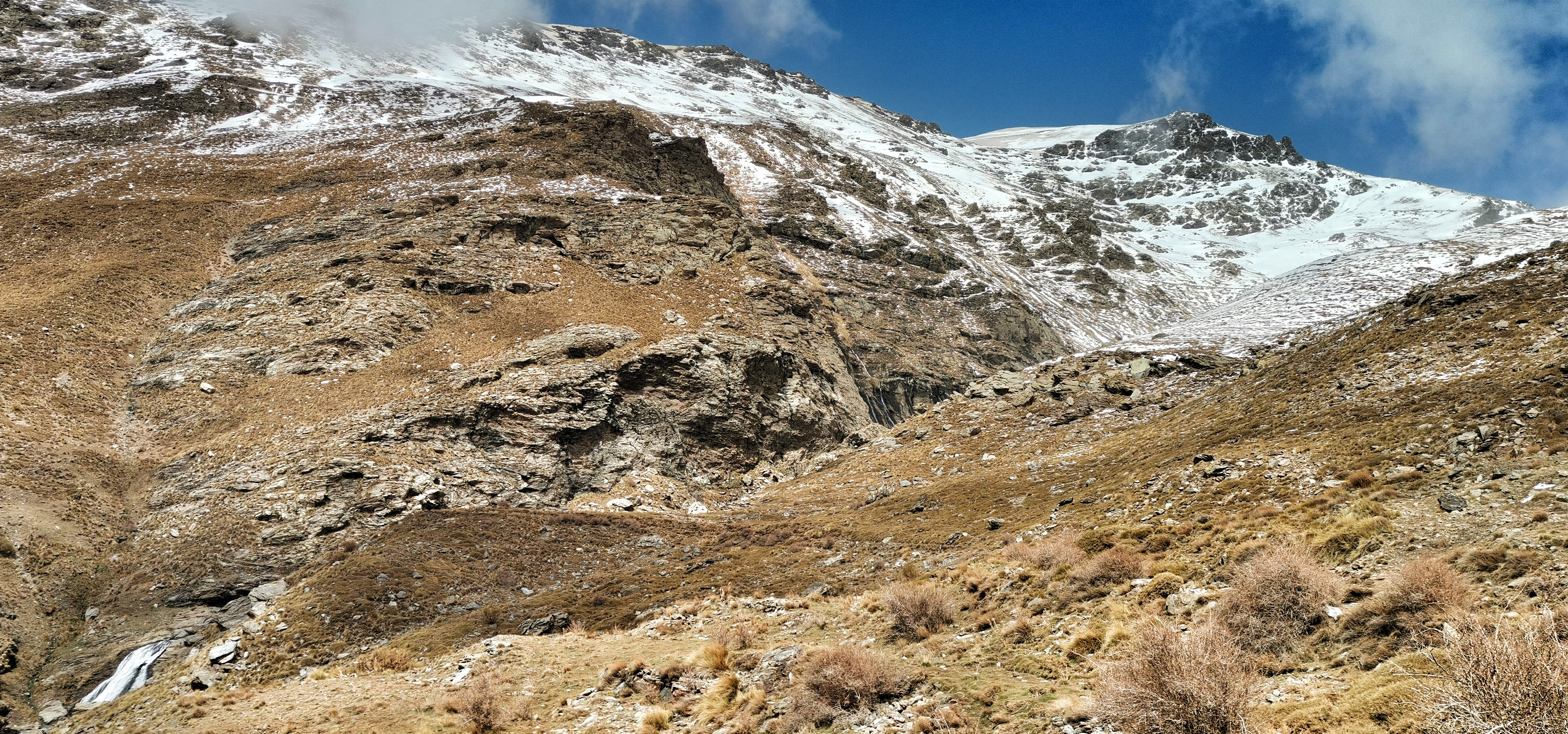 A partir de ahí, toma como eje la citada acequia, avanzando hacia el norte para dejar a su paso, a la izquierda, el Cortijo de Calvache. Más adelante y sirviéndonos aún de la Acequia Alta, entra en zona de repoblación forestal dejando a su izquierda el Cortijo de Prado – Abarca al igual que el Cortijo del llano del Espino. Continuando por la Acequia Alta, se dirige al nacimiento de la misma en el río Lanjarón pasando antes de llegar allí por el Puntal del Barranco Grande y por encima del lo que se conoce como el Haza del Enano.