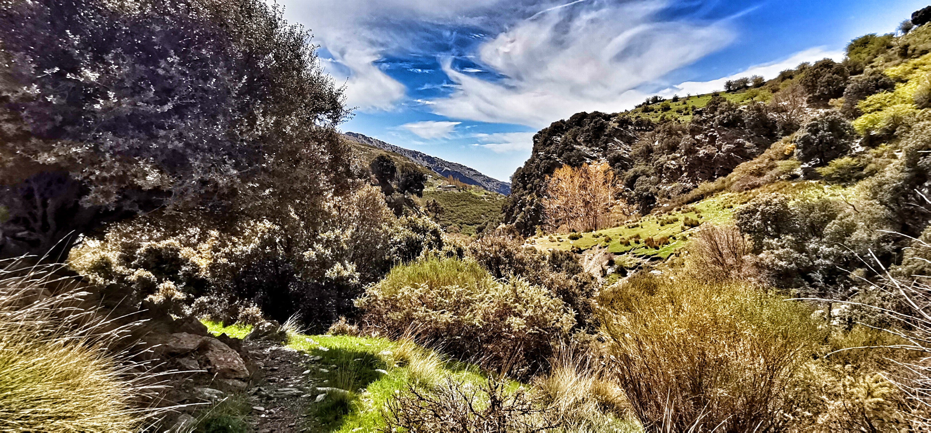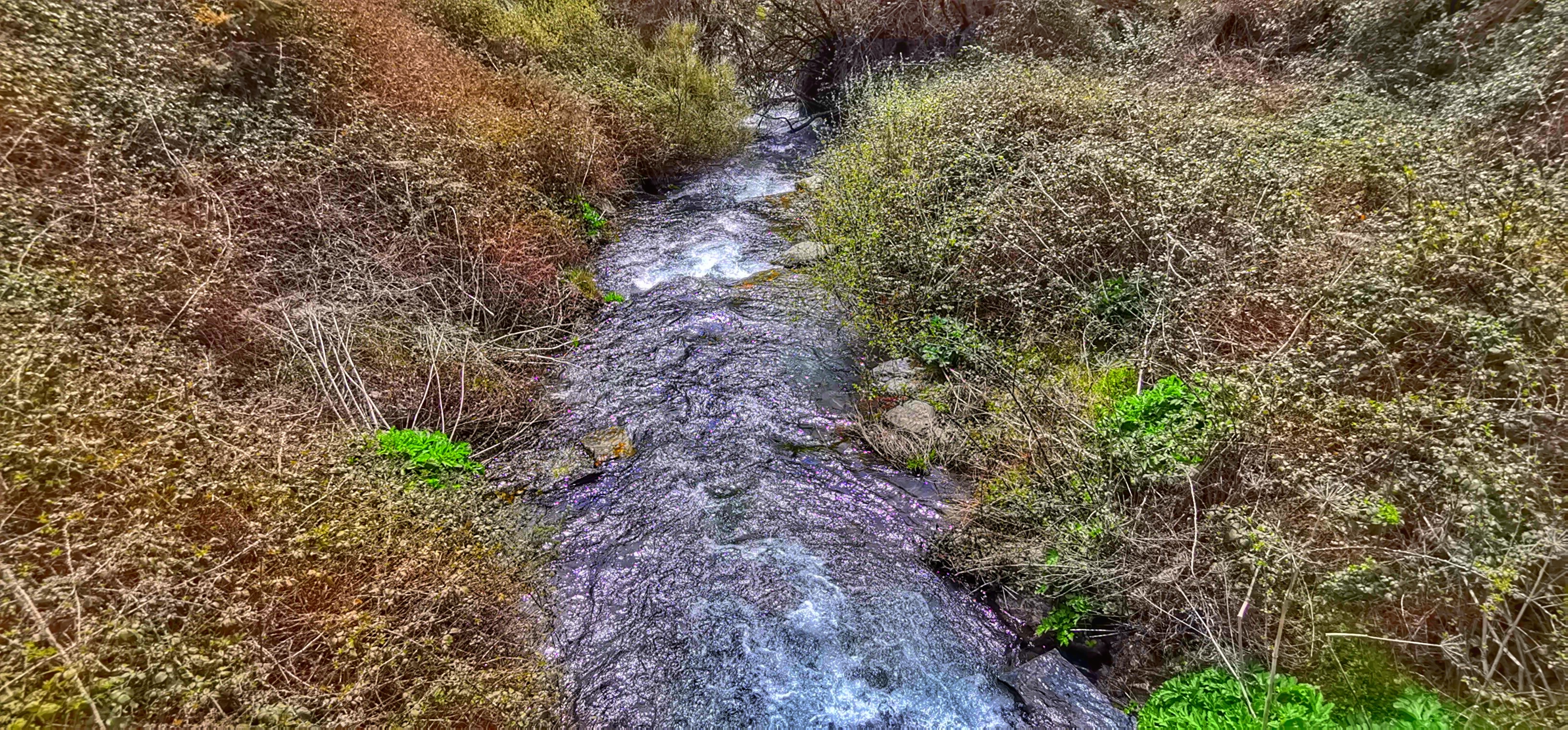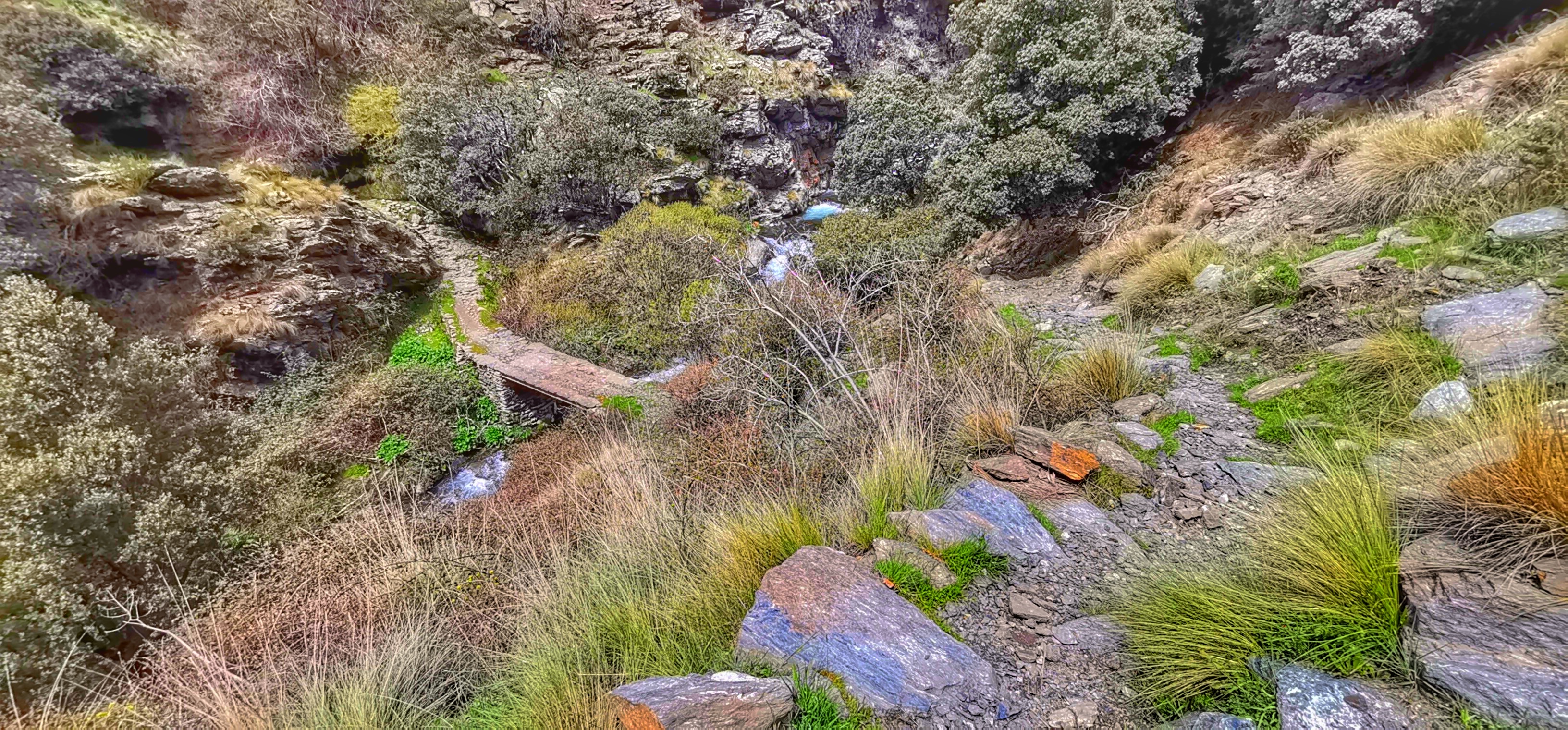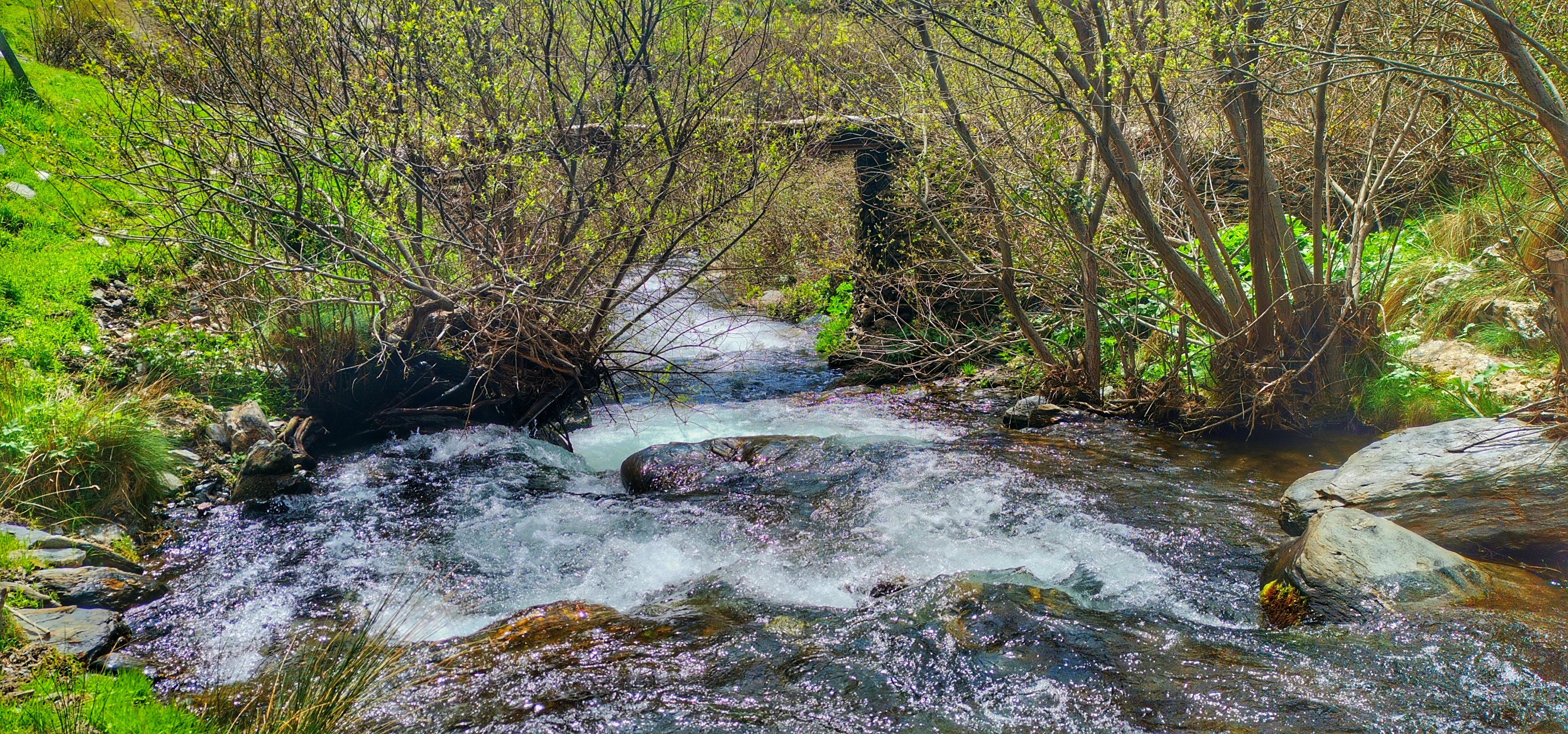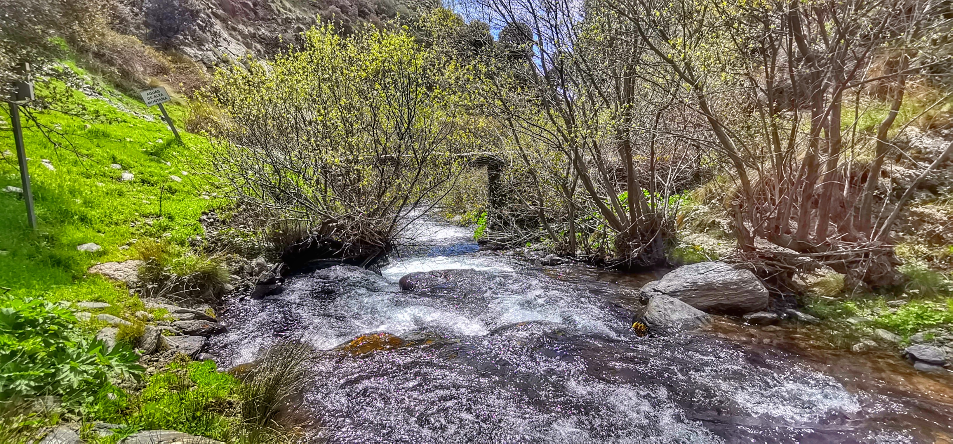 Río Lanjarón bajando caudaloso y lleno de truchas por la vereda entre el Llano del Espino y Ballesteros en una primavera exuberante.