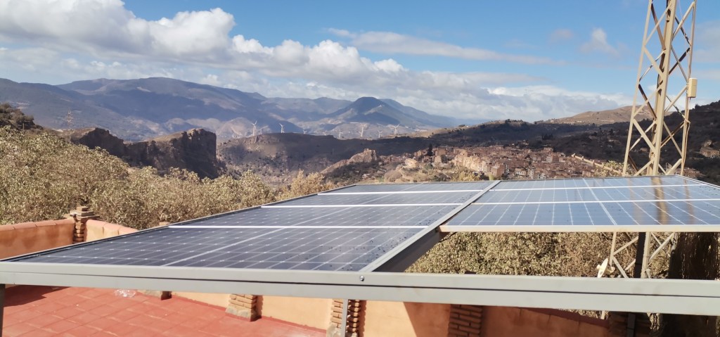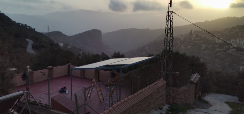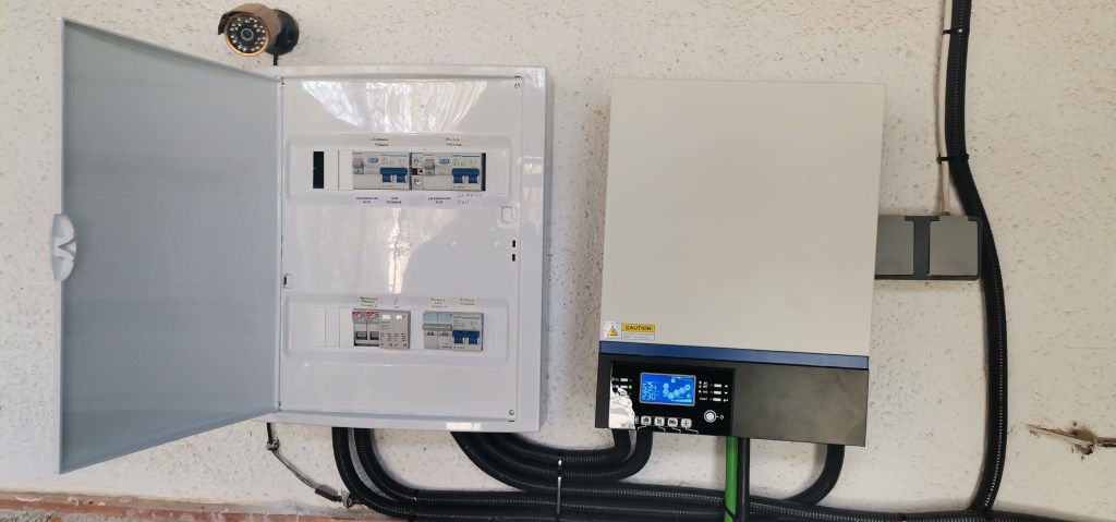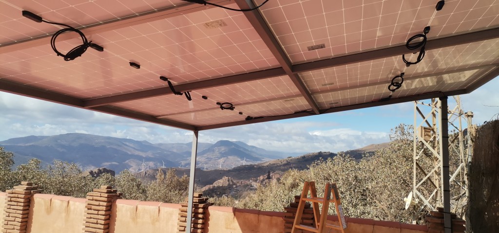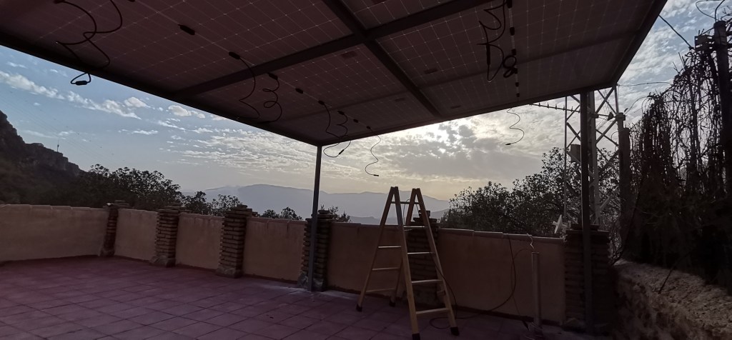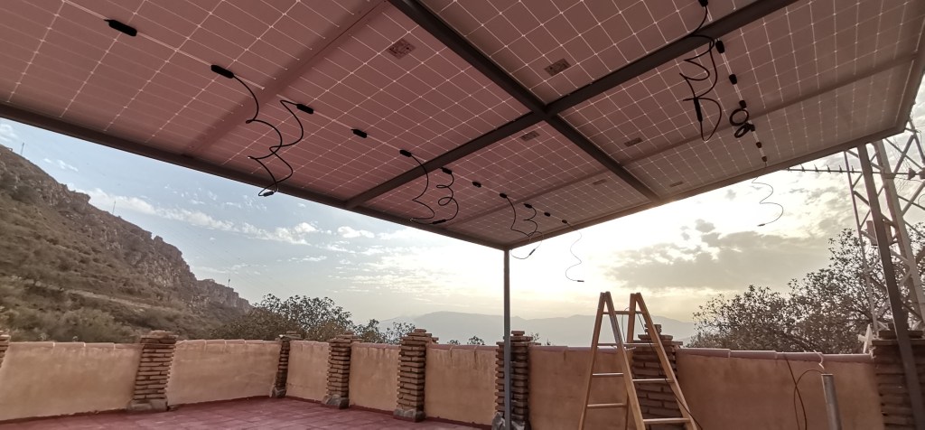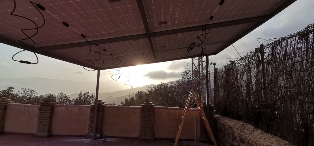 En este caso el propietario dispone de electricidad pero no quiere inyectar a la Red sino que desea gestionar la energía generada para su vivienda con el apoyo de la compañía eléctrica cuando la generación y la acumulación de la batería no sea la suficiente. Se ha optado por baterías de plomo para cambiar más adelante a baterías de litio. Los paneles son de 400 w de célula partida también con pensamiento de ampliar y se han montado en una pergola solar hecha a medida para aprovechar la superficie de la terraza y dar un poco de sombra. El inversor es un Offgrid marca Voltronic Axpert de 48v 5000w.