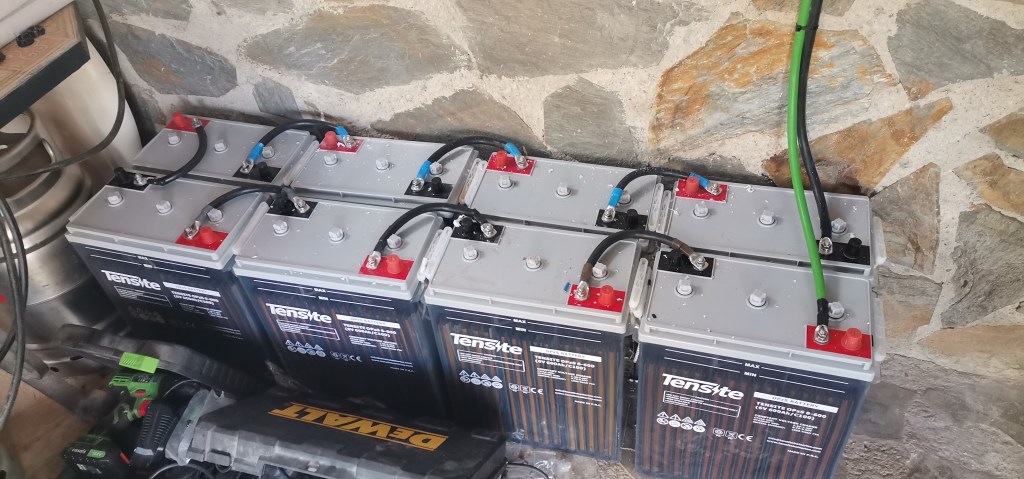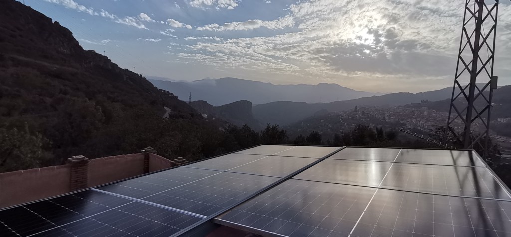 Sistema híbrido con apoyo de la red eléctrica y acumulación de excedentes de la producción de los paneles no aprovechada, a batería. 2200w pico de fotovoltaica. Inversor de 3000w.